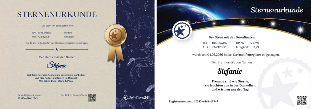 Nos complace poderofrecerle más diseños fantásticos para el certificado de estrella de su ceremonia de nombramiento de estrellas . No hemos escatimado gastos ni esfuerzos y hemos buscado nuevos certificados en el marco de un concurso de diseño. Como resultado , ahora ofrecemos dos nuevos certificados en formato apaisado para que tenga más opciones a la hora de nombrar a sus estrellas.